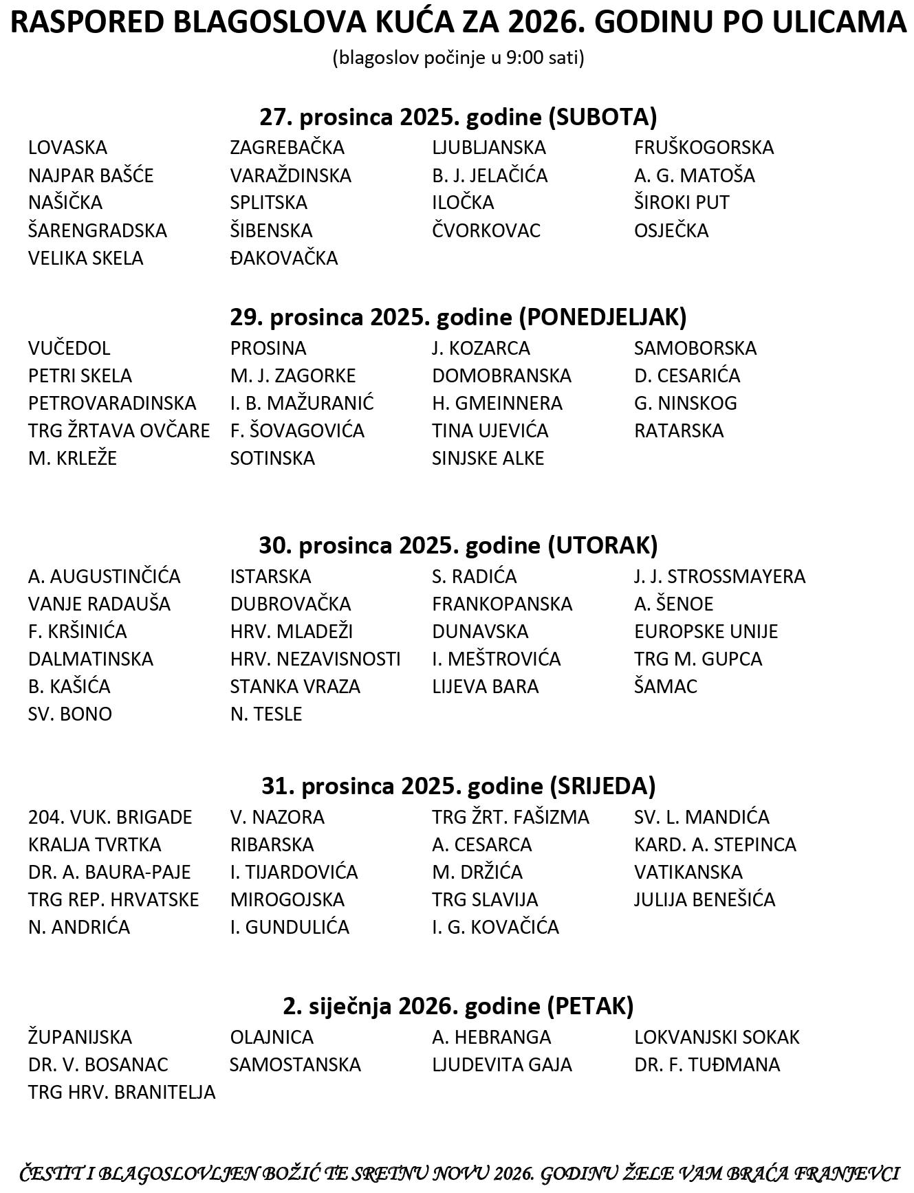Raspored blagoslova kuća za 2026. godinu po ulicama
